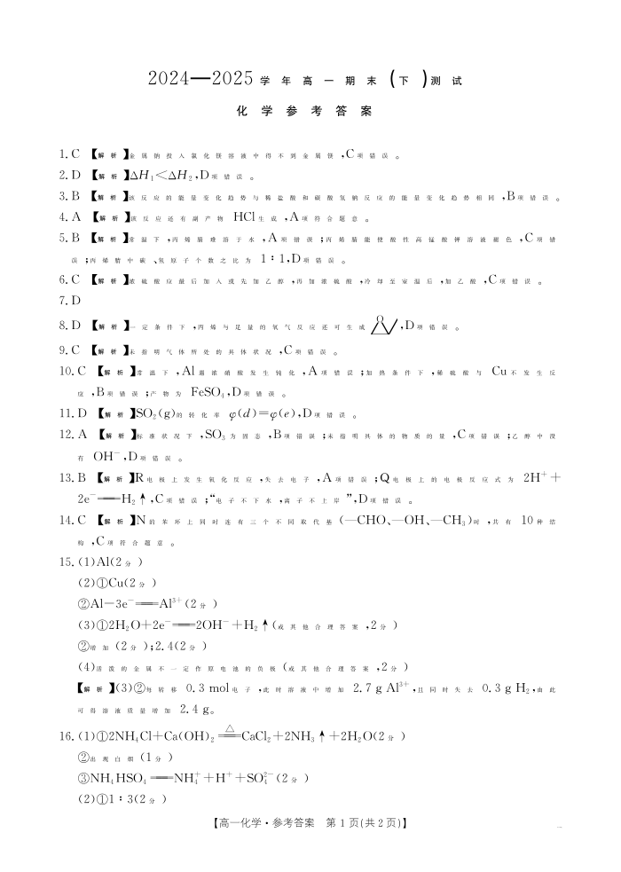 河南新乡2024-2025学年下学期高一化学试卷(期末考试)答案.pdf