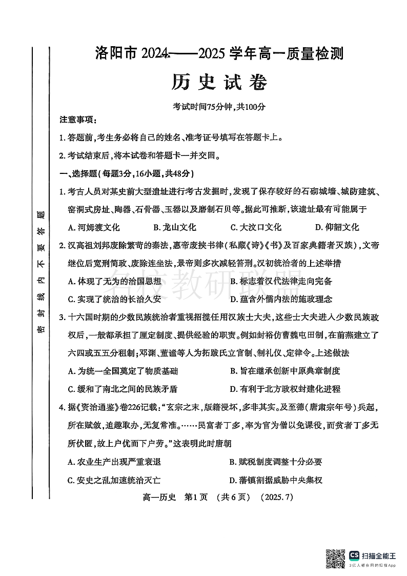 历史试卷-洛阳市2024-2025高一下期末.pdf