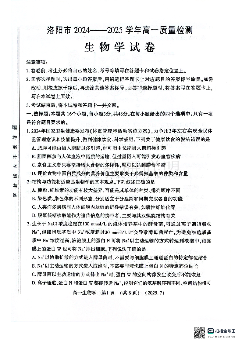 生物试卷-洛阳市2024-2025高一下期末.pdf