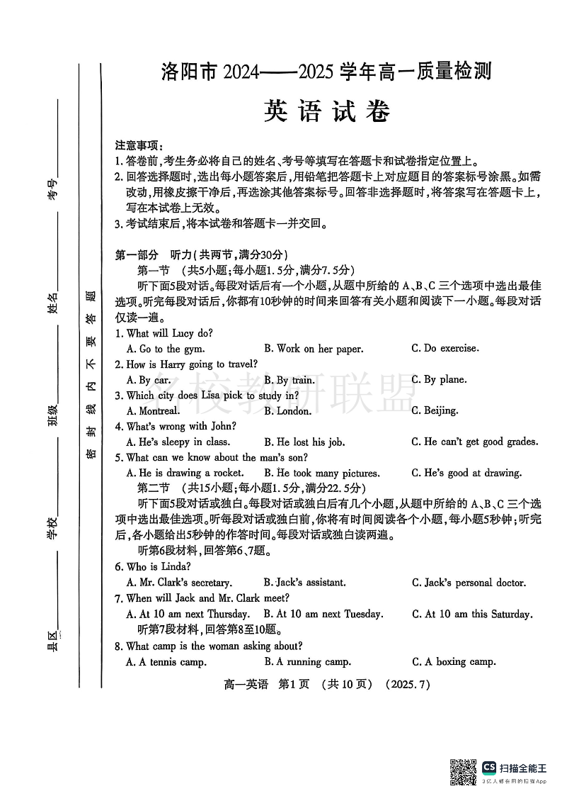 英语试卷-洛阳市2024-2025高一下期末.pdf
