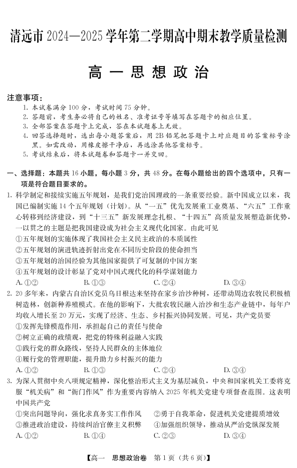 广东省清远市2024-2025学年第二学期高一期末教学质检 政治.pdf