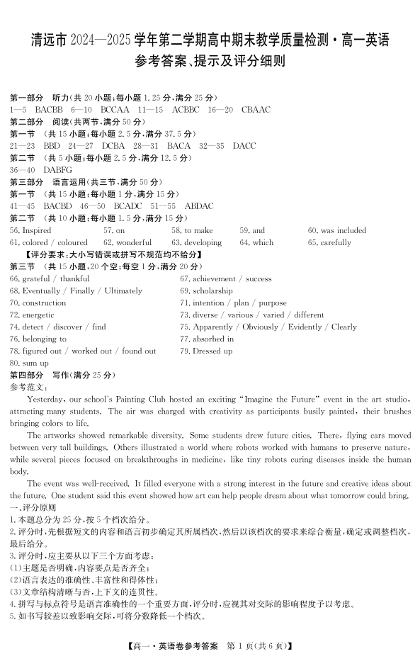 广东省清远市2024-2025学年第二学期高一期末教学质检 英语答案.pdf