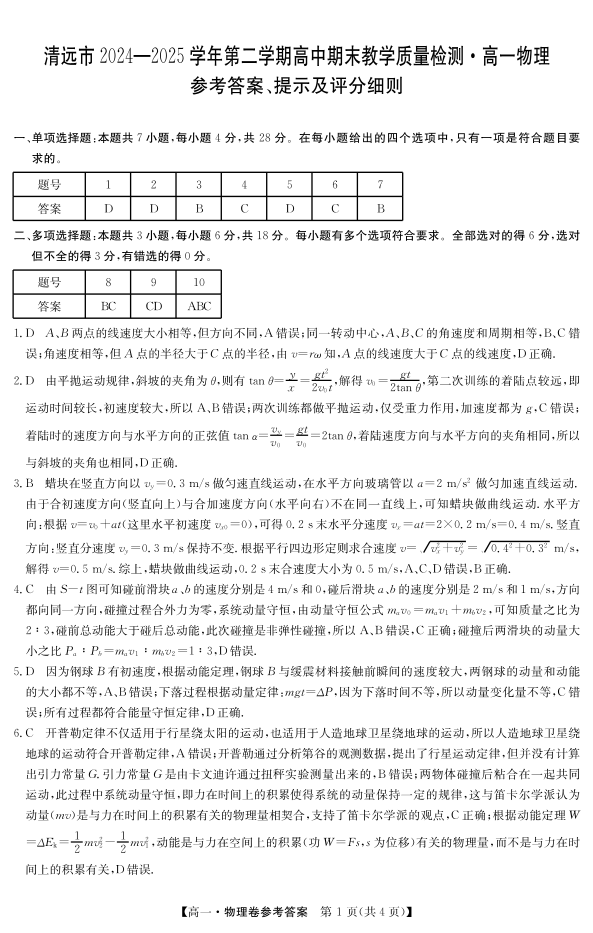 广东省清远市2024-2025学年第二学期高一期末教学质检 物理答案.pdf
