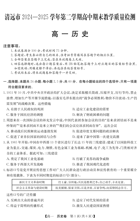 广东省清远市2024-2025学年第二学期高一期末教学质检 历史.pdf
