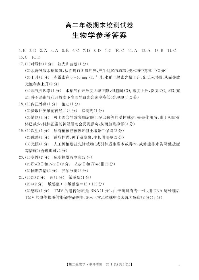 云南省临沧市2024-2025学年下学期高二期末质量测试 生物答案.pdf