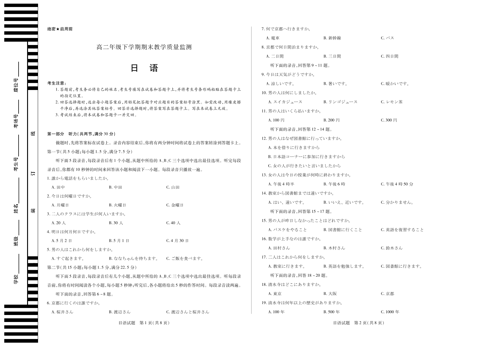 日语平顶山高二下教学质量监测单色.pdf