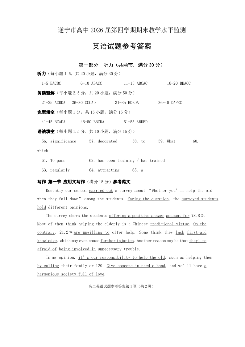 四川省遂宁市高中2026届高二第四学期期末教学水平监测 英语答案.pdf