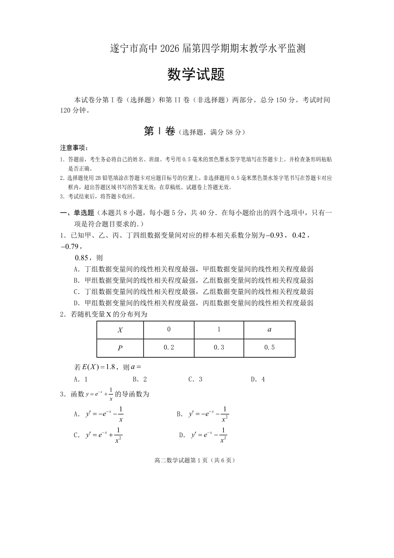 四川省遂宁市高中2026届高二第四学期期末教学水平监测 数学.pdf