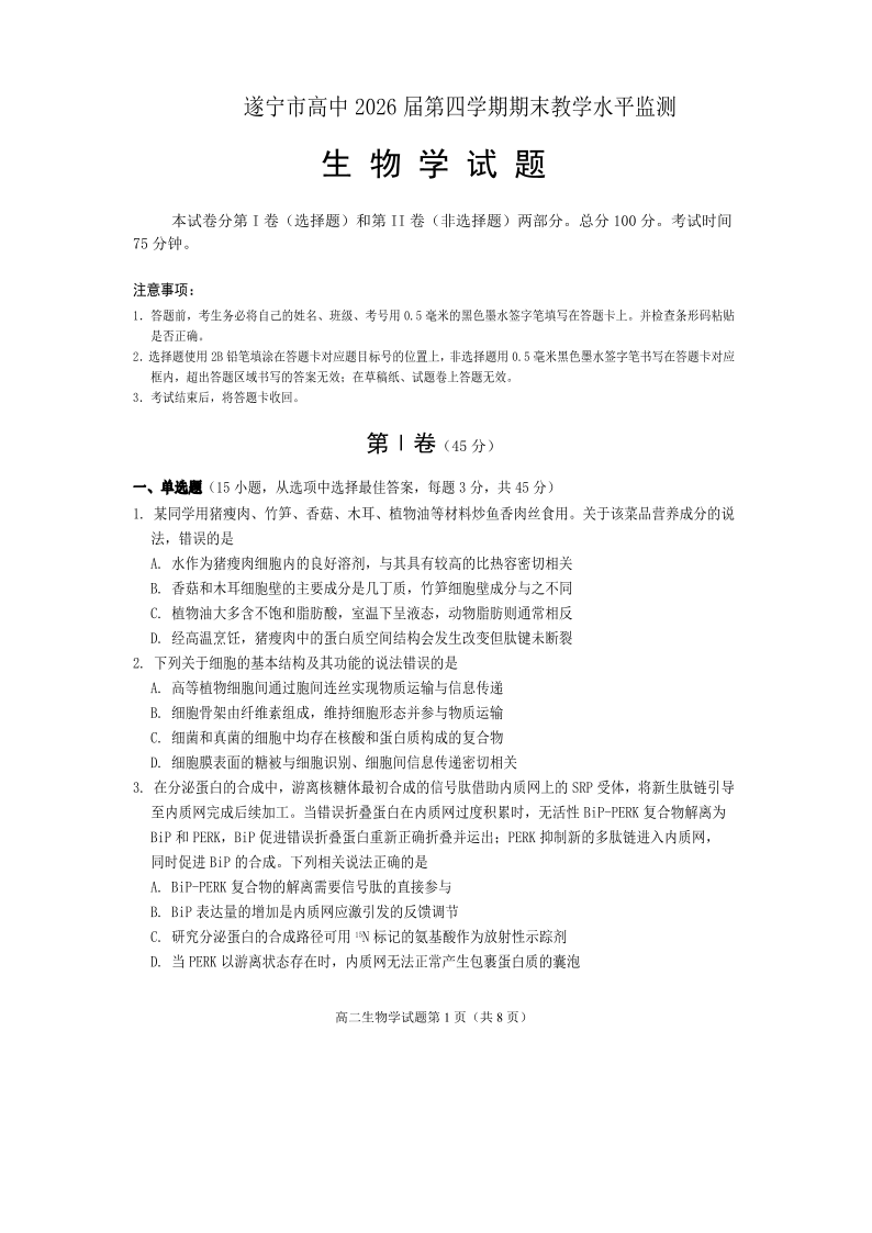 四川省遂宁市高中2026届高二第四学期期末教学水平监测 生物.pdf
