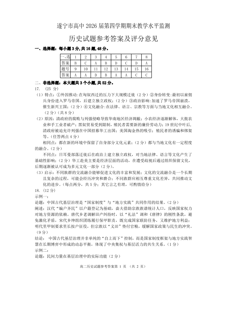 四川省遂宁市高中2026届高二第四学期期末教学水平监测 历史答案.pdf