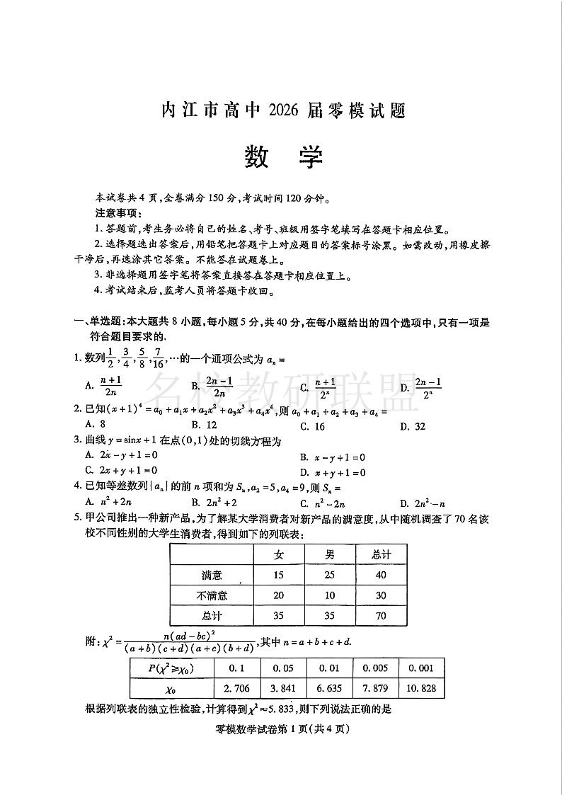 四川省内江市高中2026届零模试题(高二下学期期末考试)数学试题(含答案).pdf