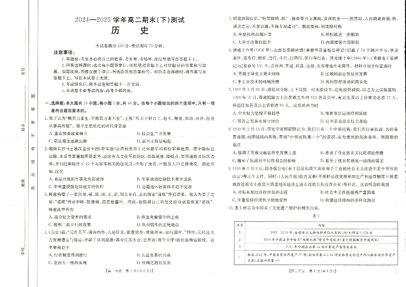 河南新乡2024-2025学年下学期高二历史试卷(期末考试).pdf