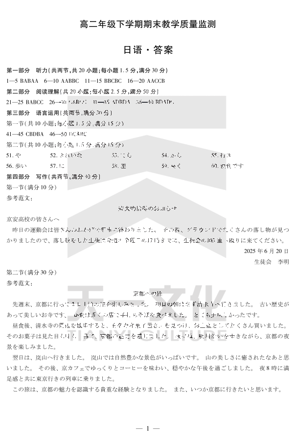河南省平顶山市2024-2025高二年级下学期期末教学质量监测 日语答案.pdf
