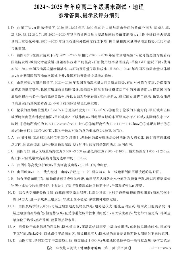 河北省石家庄市七县联合体2024-2025学年高二年级下学期期末考试 地理答案.pdf