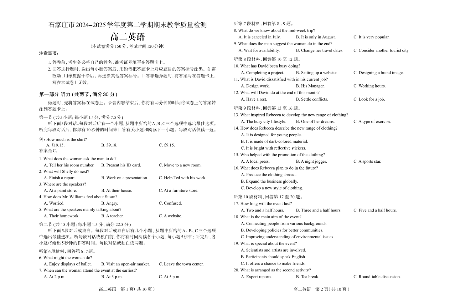 石家庄市2024~2025学年度第二学期高二期末教学质量检测 英语试卷(含答案).pdf