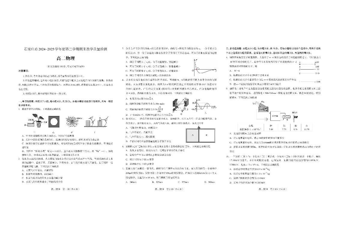 石家庄市2024~2025学年度第二学期高二期末教学质量检测 物理试卷(含答案).pdf