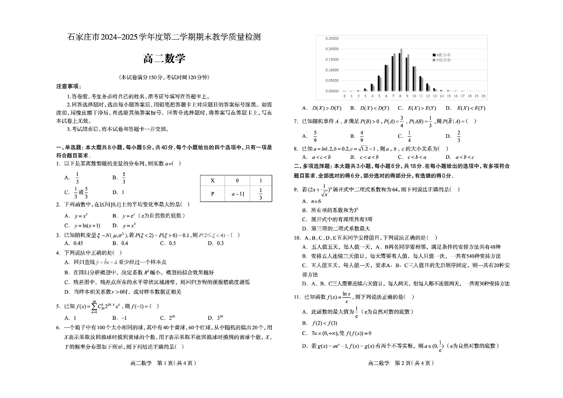 石家庄市2024~2025学年度第二学期高二期末教学质量检测 数学试卷(含答案).pdf
