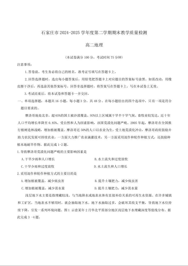 石家庄市2024~2025学年度第二学期高二期末教学质量检测 地理试卷(含答案).docx