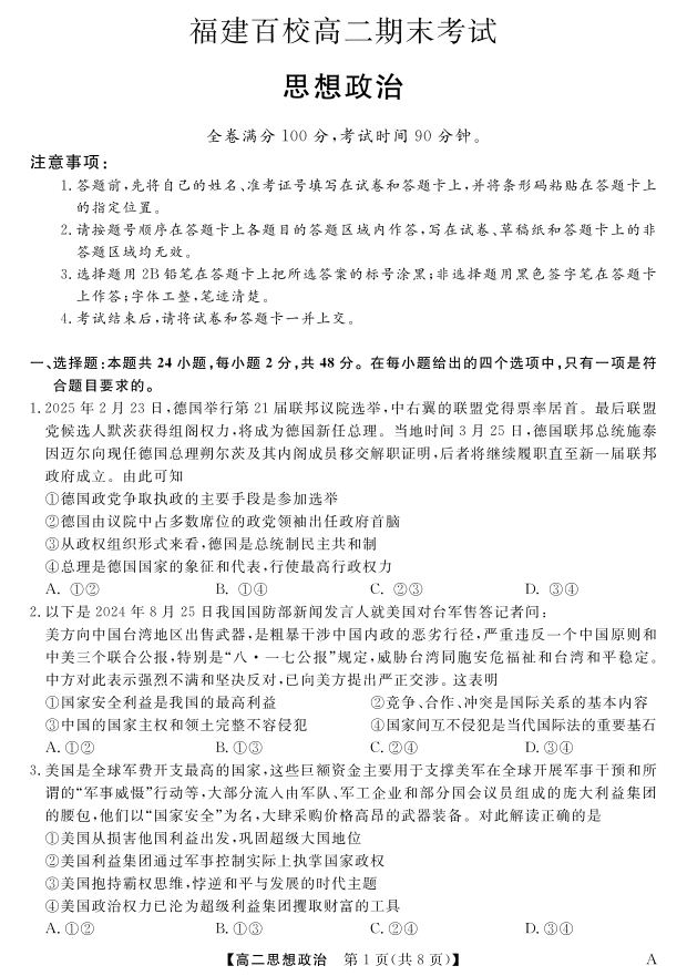 福建省百校2024-2025学年高二下学期期末考试 政治.pdf