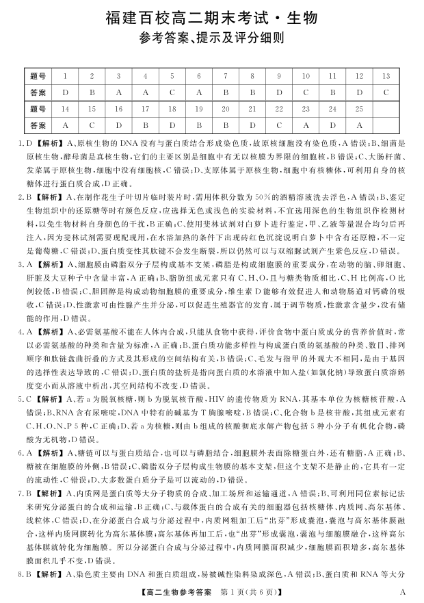 福建省百校2024-2025学年高二下学期期末考试 生物答案.pdf
