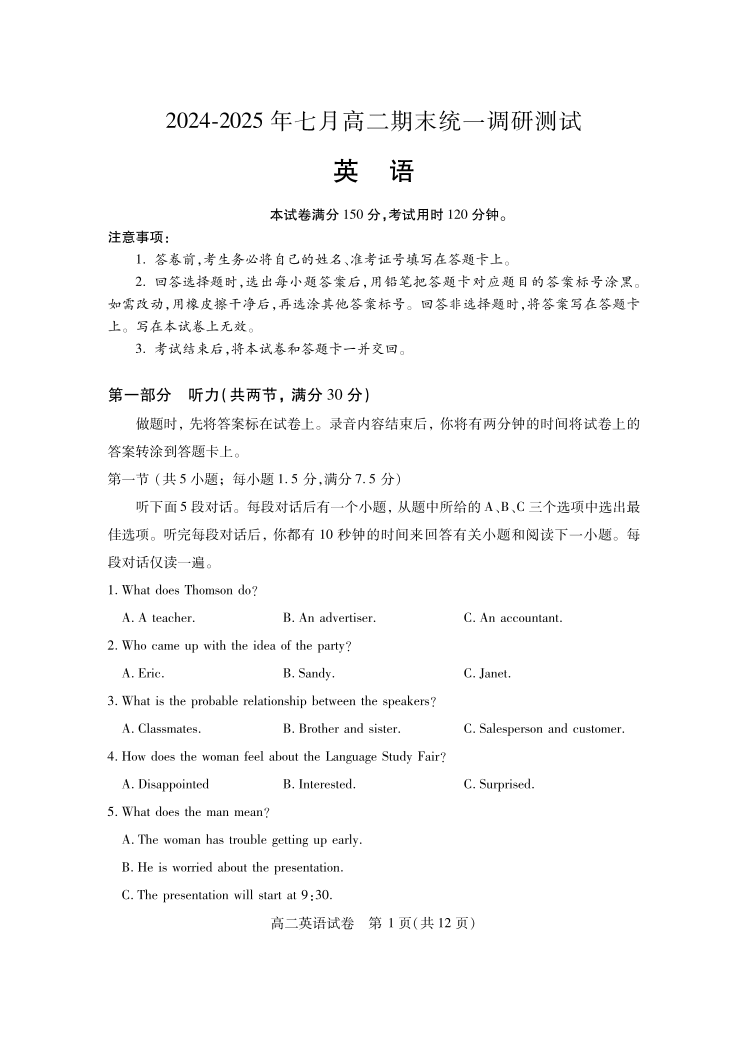 湖北省2024-2025学年七月高二期末统一调研测试 英语.pdf