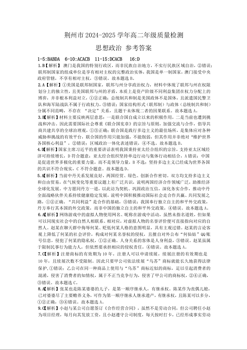 湖北省荆州市2024-2025学年高二年级质量检测 政治参考答案.doc