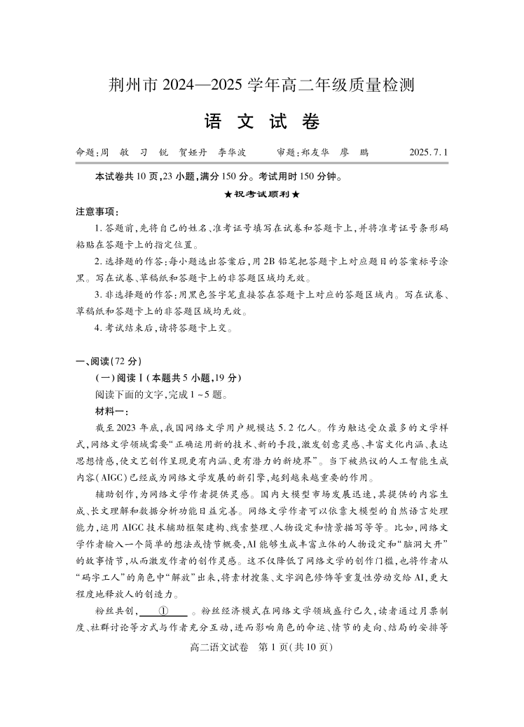 湖北省荆州市2024-2025学年高二年级质量检测 语文.pdf
