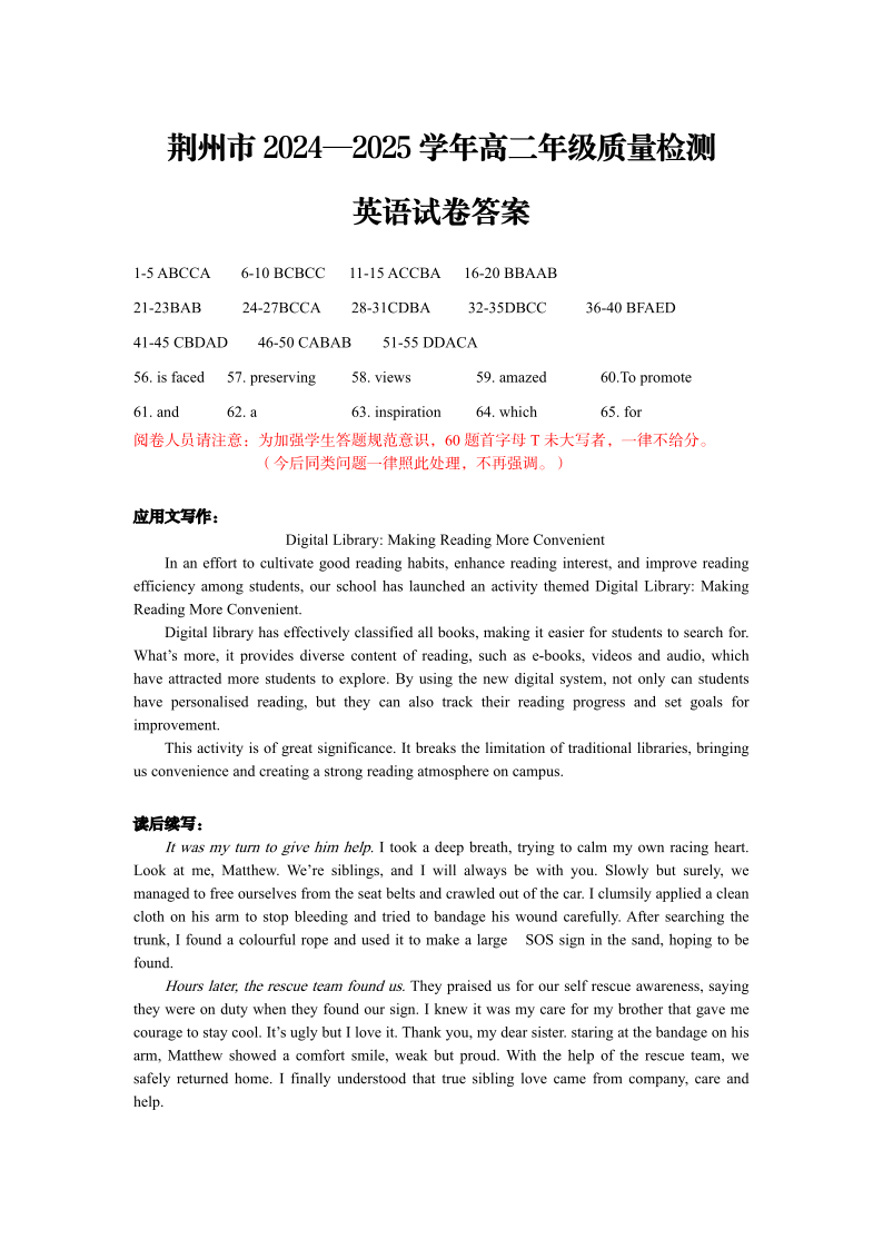 湖北省荆州市2024-2025学年高二年级质量检测 英语参考答案.pdf