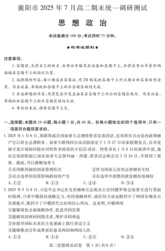 湖北省襄阳市225年7月高二期末统一调研测试 政治.pdf