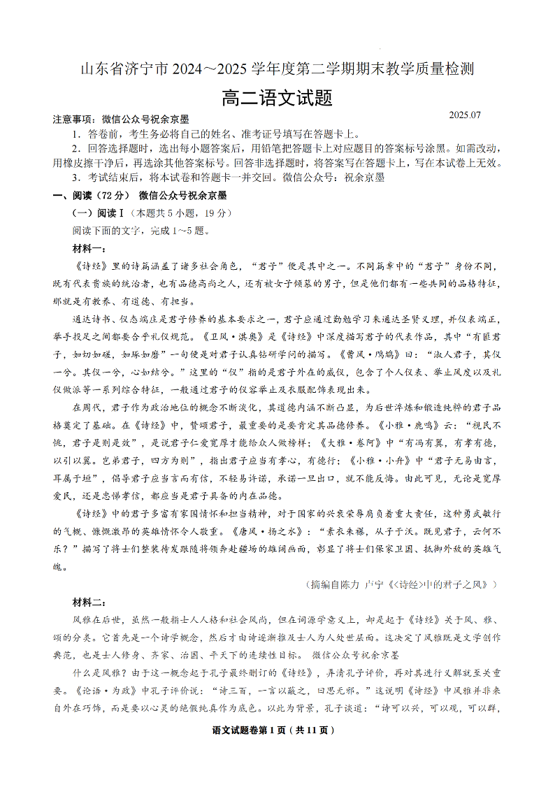 山东省济宁市2024-2025学年度高二质量检测 语文试题(含答案).pdf