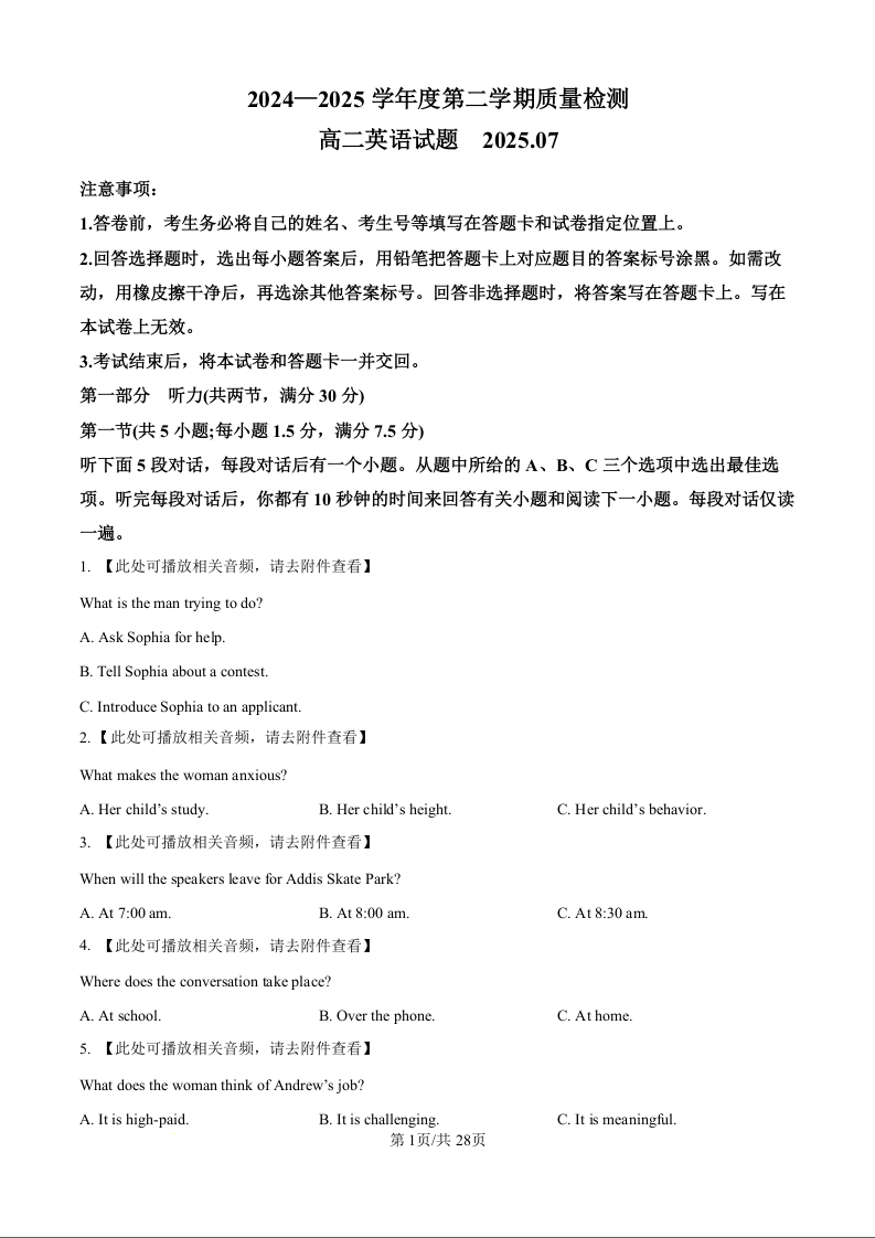 山东省济宁市2024-2025学年度高二质量检测 英语试题(含答案).docx