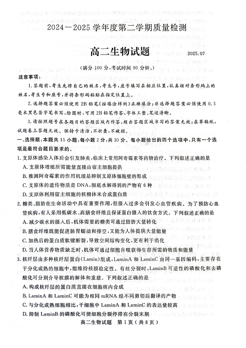 山东省济宁市2024-2025学年度高二质量检测 生物.pdf