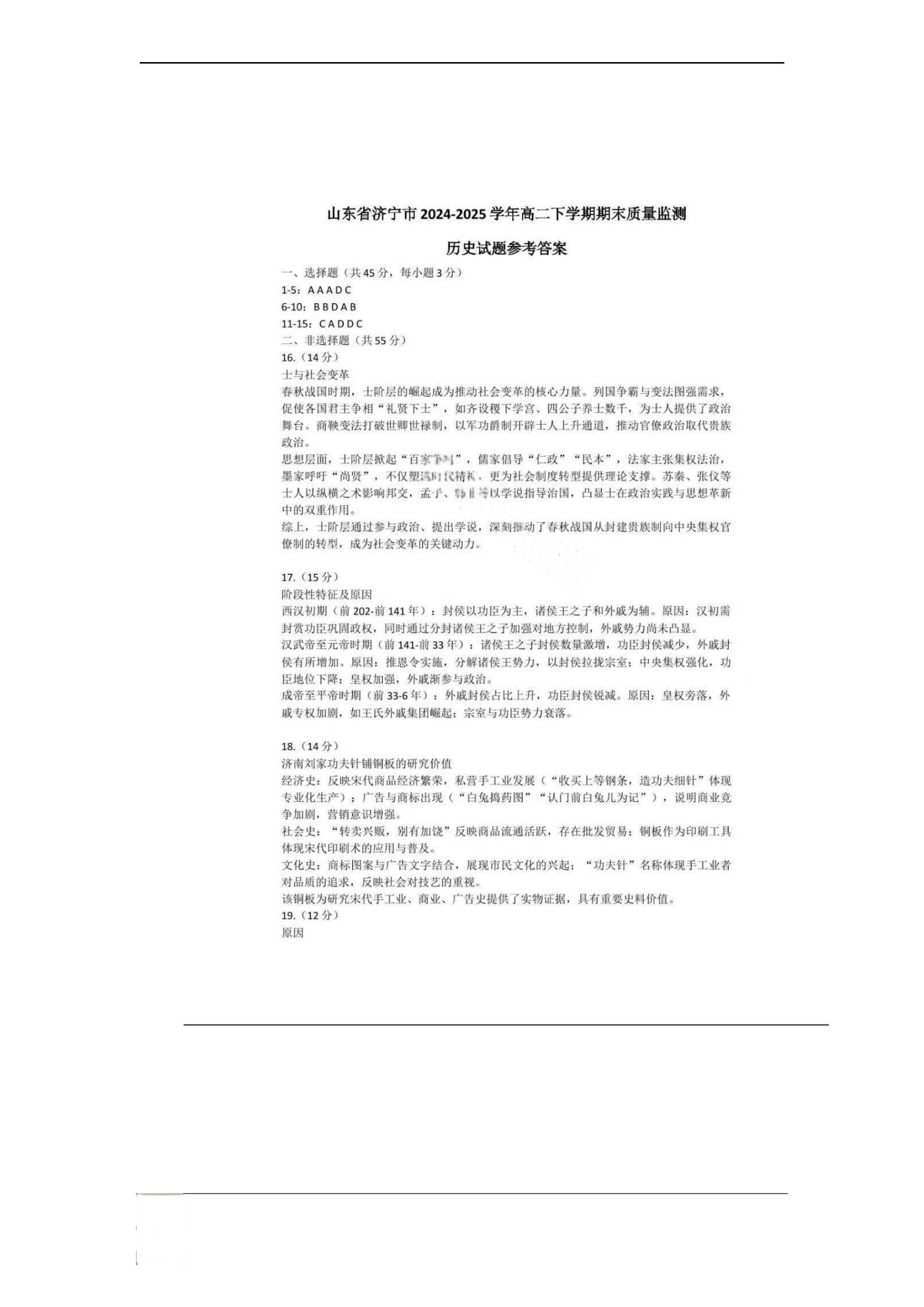 山东省济宁市2024-2025学年度高二质量检测 历史答案.pdf
