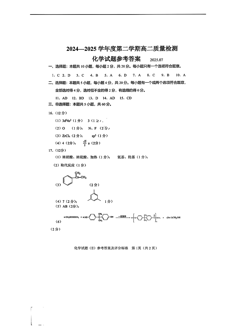 山东省济宁市2024-2025学年度高二质量检测 化学答案.pdf