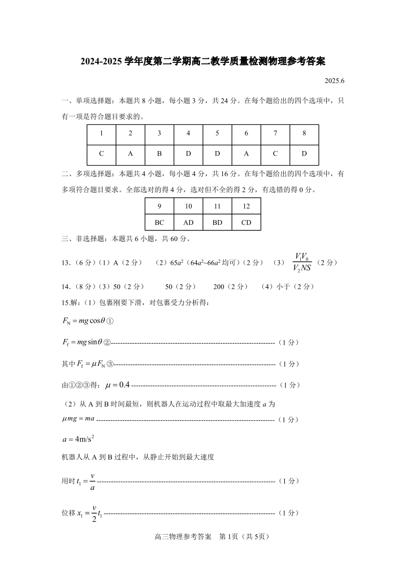 山东省淄博市2026届第二学期高二教学质量检测 物理答案.pdf