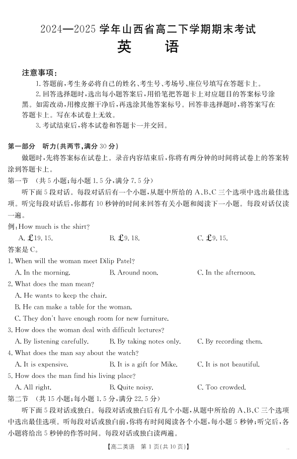 山西省2024-2025学年高二下学期期末考试 英语.pdf