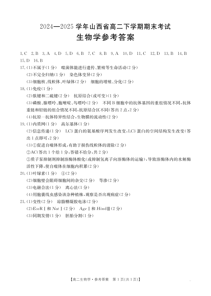 山西省2024-2025学年高二下学期期末考试 生物答案.pdf