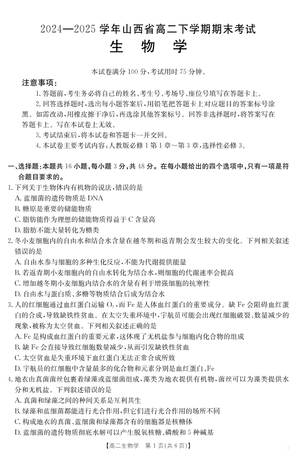 山西省2024-2025学年高二下学期期末考试 生物.pdf