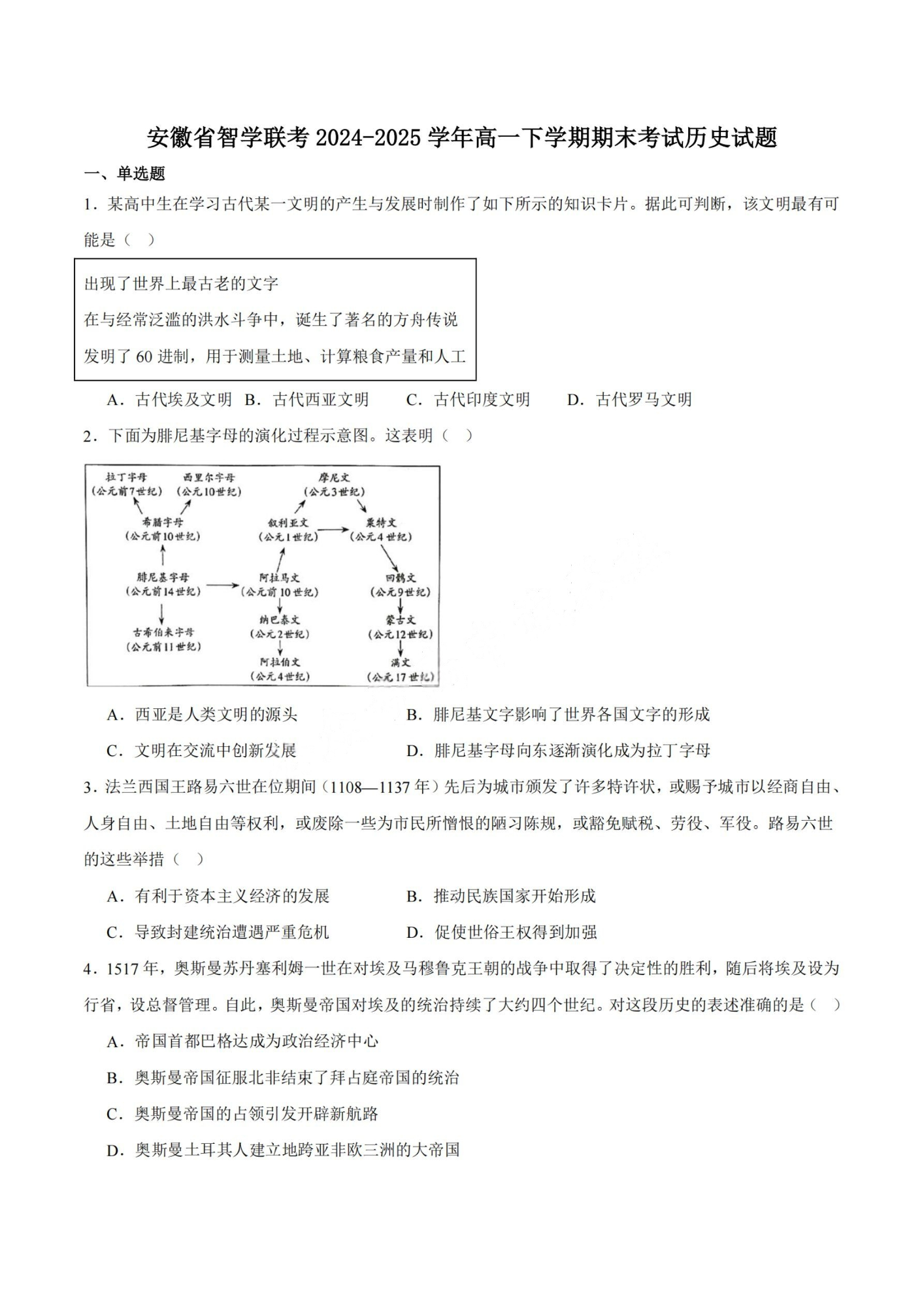 安徽省智学联考2024-2025学年高一下学期期末考试 历史试卷(含答案).pdf