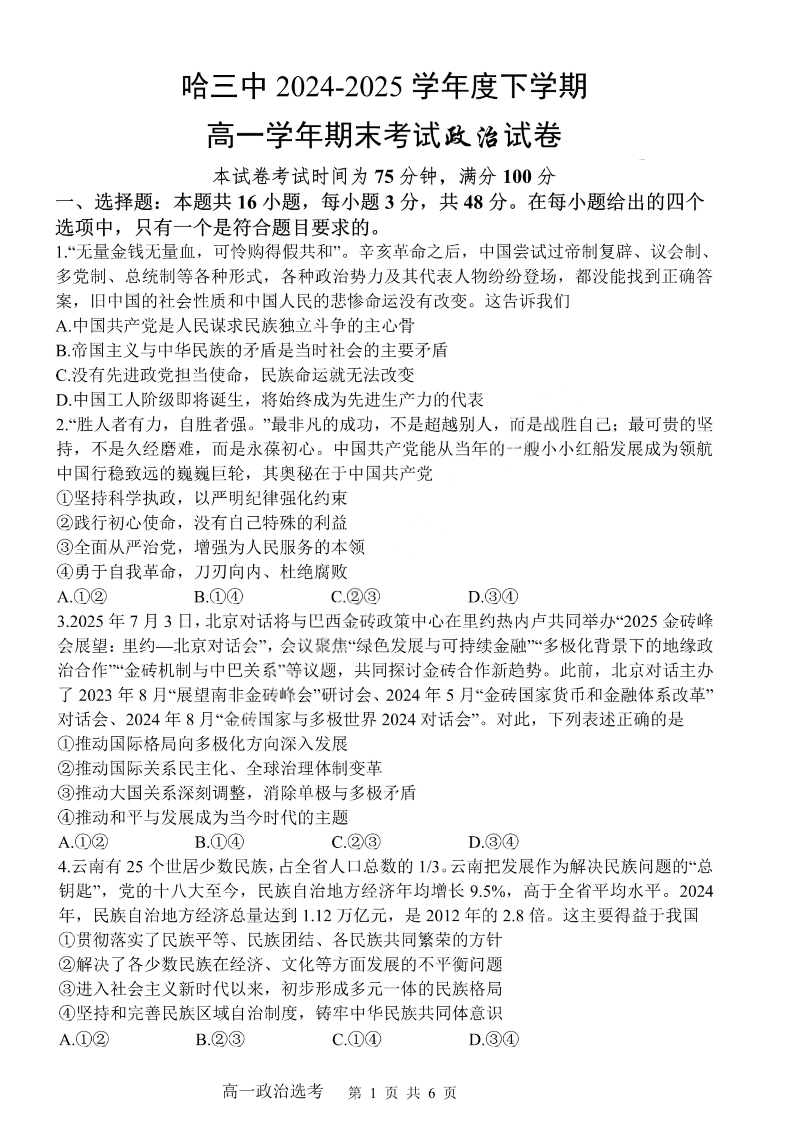 哈尔滨第三中学2024-2025学年度下学期高一学年期末考试 政治.pdf