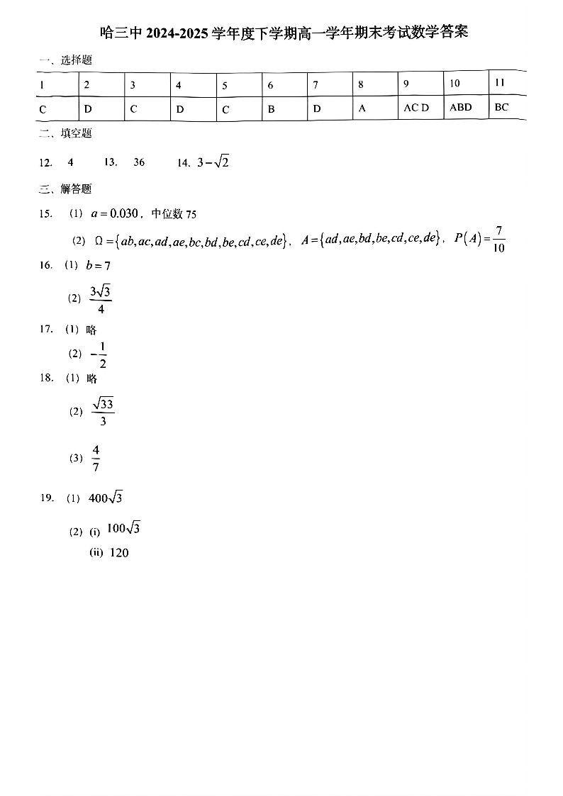 哈尔滨第三中学2024-2025学年度下学期高一学年期末考试 数学答案.pdf