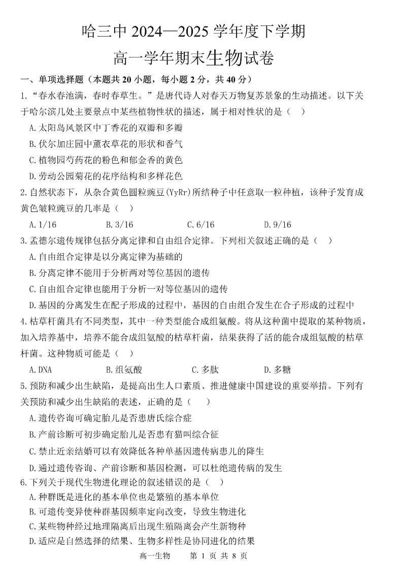 哈尔滨第三中学2024-2025学年度下学期高一学年期末考试 生物.pdf