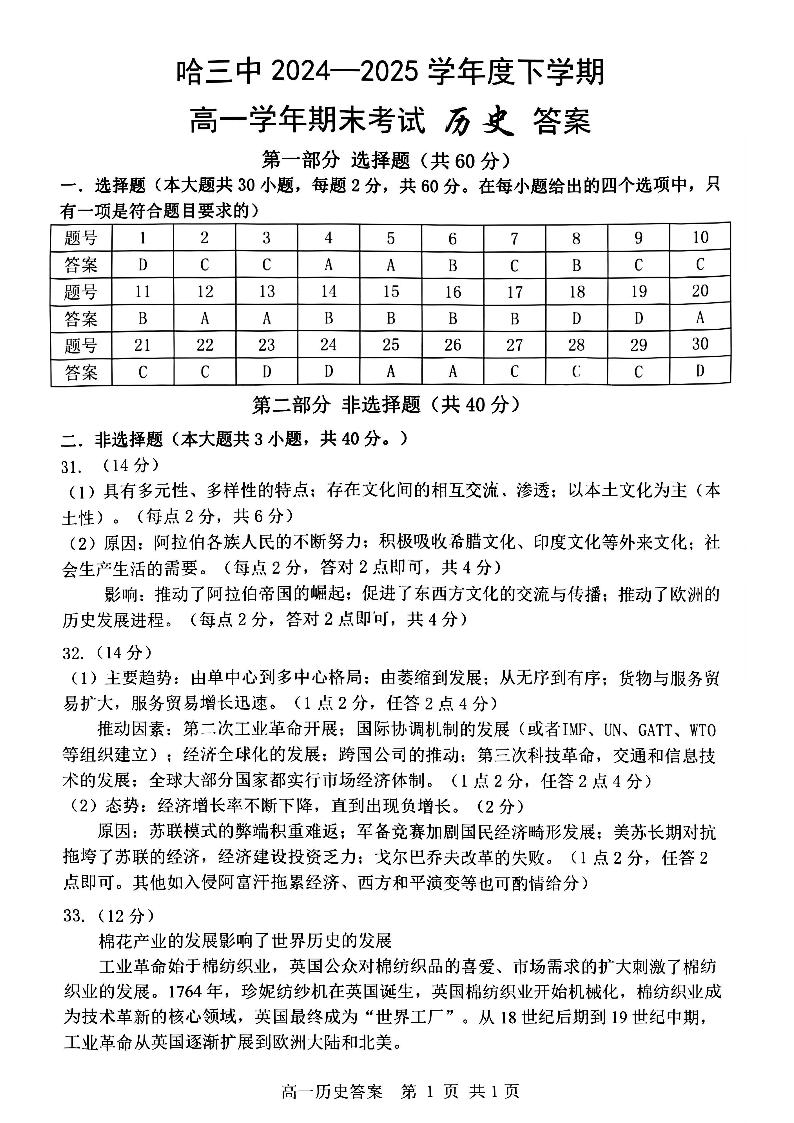 哈尔滨第三中学2024-2025学年度下学期高一学年期末考试 历史答案.pdf