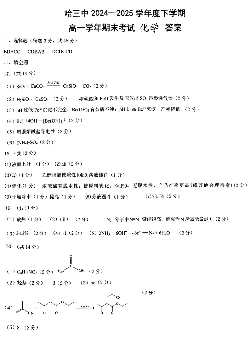 哈尔滨第三中学2024-2025学年度下学期高一学年期末考试 化学答案.pdf