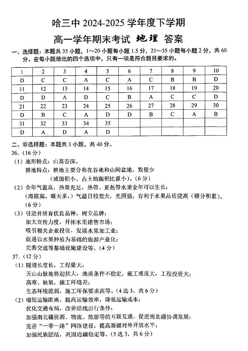 哈尔滨第三中学2024-2025学年度下学期高一学年期末考试 地理答案.pdf