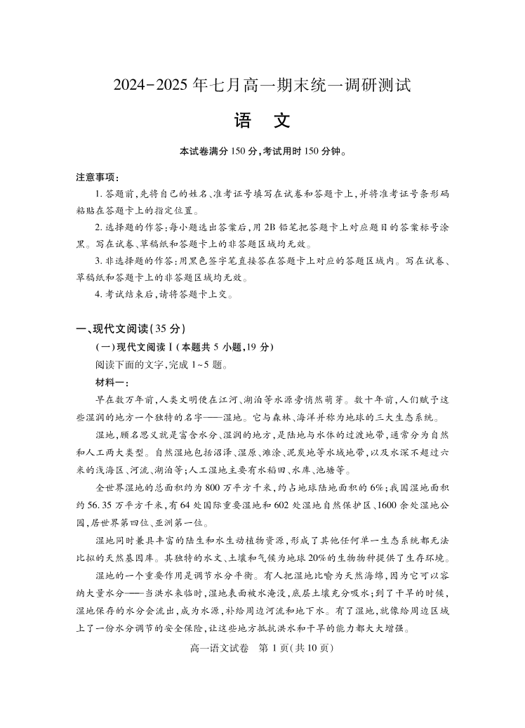 湖北省2024-2025学年七月高一期末统一调研测试 语文.pdf
