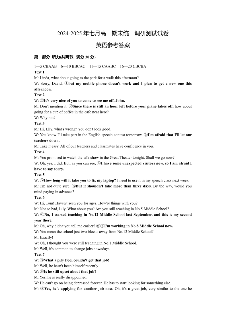 湖北省2024-2025学年七月高一期末统一调研测试 英语答案.pdf