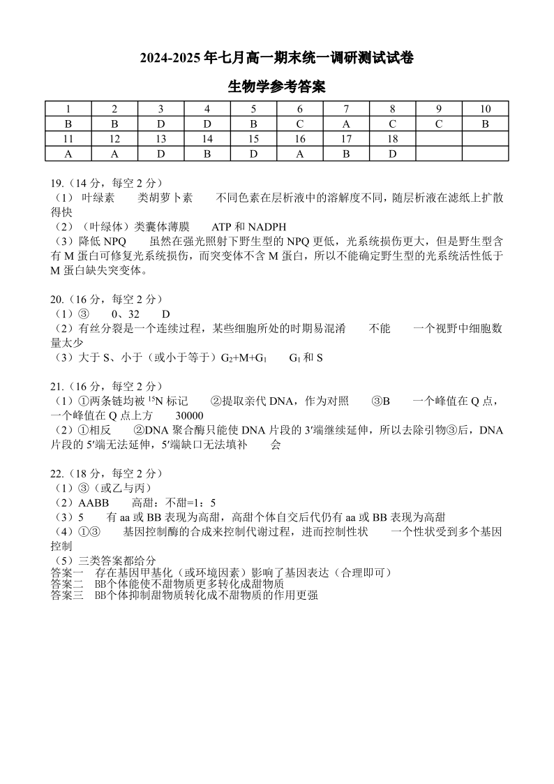 湖北省2024-2025学年七月高一期末统一调研测试 生物答案.pdf