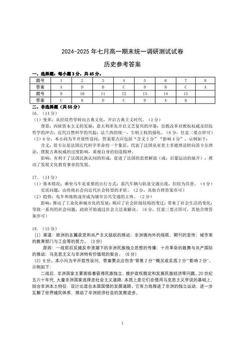 湖北省2024-2025学年七月高一期末统一调研测试 历史答案.pdf