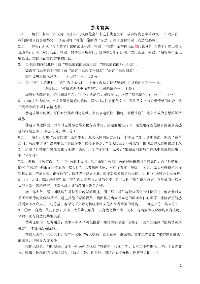 湖北省荆州市2024-2025学年高一年级质量检测 语文参考答案.pdf